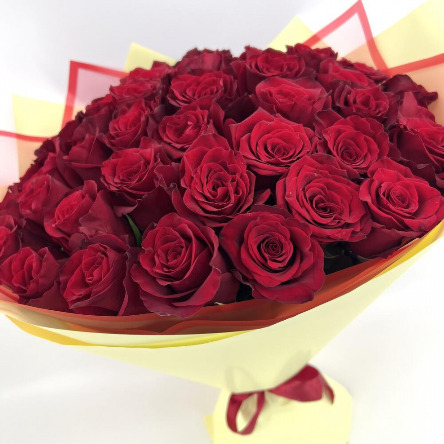 На фото букет из 51 бордовой розы. В составе: роза 51 шт, фоамиран 3 шт, атласная лента 1 шт, . Все цветы свежие и ароматные, букет красиво оформлен и отлично подходит для подарка. Доступна доставка цветов или самовывоз.