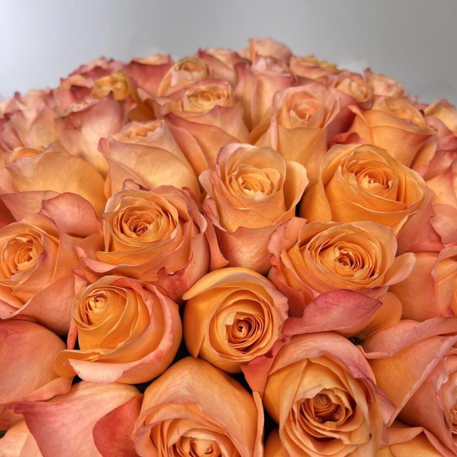 На фото букет из 75 коралловых роз. В составе: роза 75 шт, дизайнерская упаковка 1 шт, атласная лента 1 шт, . Все цветы свежие и ароматные, букет красиво оформлен и отлично подходит для подарка. Доступна доставка цветов или самовывоз.