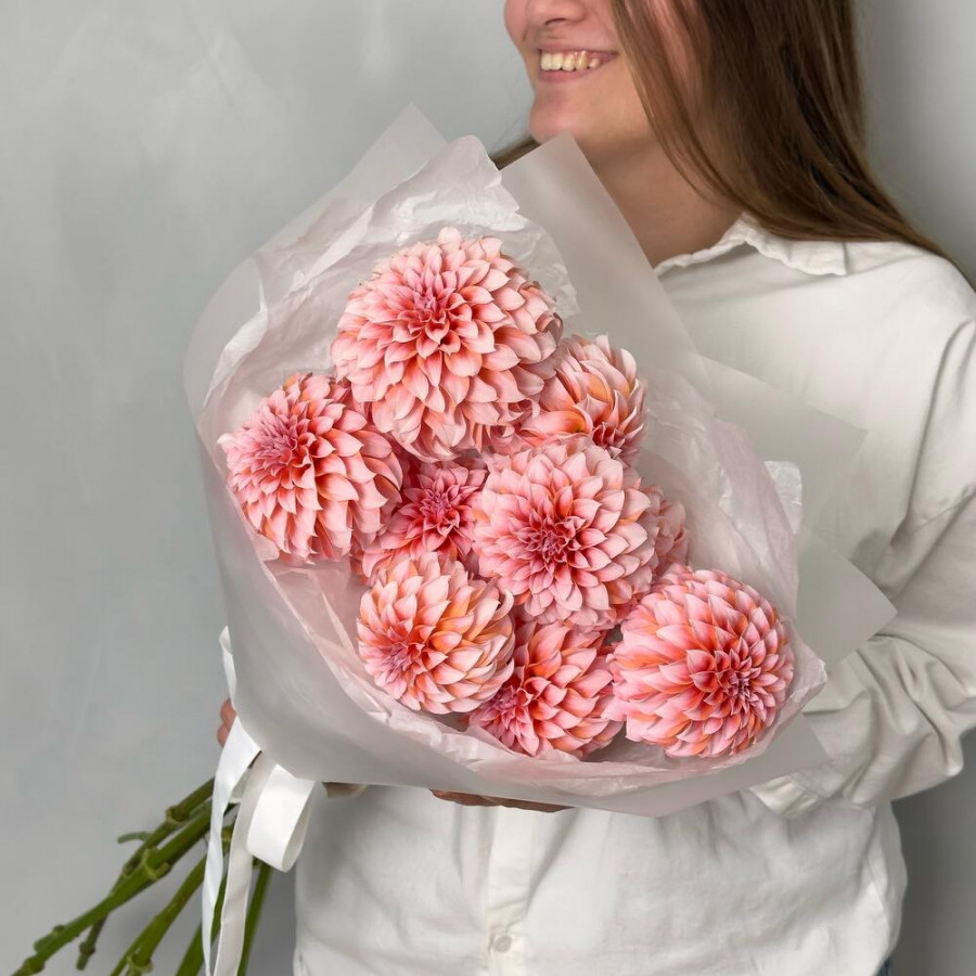 На фото букет из 9 персиково-розовых георгин. В составе: георгина 9 шт, дизайнерская упаковка 3 шт, атласная лента 2 шт, . Все цветы свежие и ароматные, букет красиво оформлен и отлично подходит для подарка. Доступна доставка цветов или самовывоз.