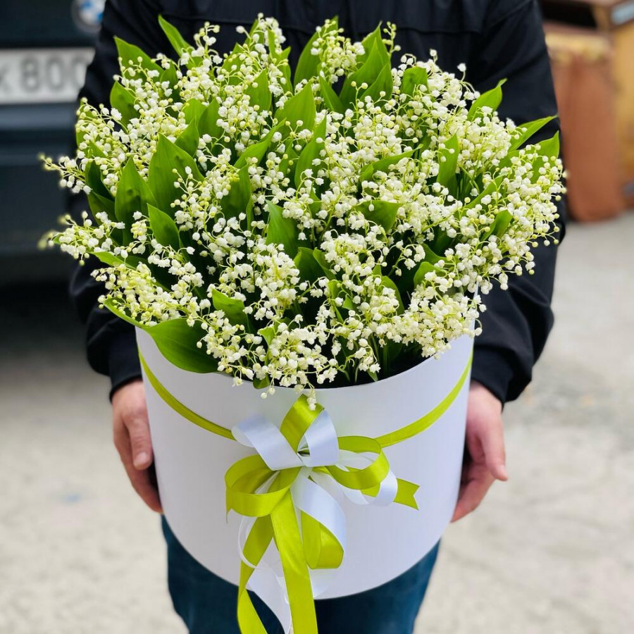 На фото ландыши в шляпной коробке xl. В составе: ландыш 75 шт, шляпная коробка (xl) 1 шт, атласная лента 2 шт, . Все цветы свежие и ароматные, букет красиво оформлен и отлично подходит для подарка. Доступна доставка цветов или самовывоз.
